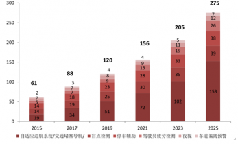 2025 年全球 ADAS 市場規模達 2000 億元,ACC (自適應巡航系統)成為重要增長點。據估計,2025 年全球 ADAS 市場規模將達 275 億歐元(約 2000 億人民幣),CAGR 達到 16%,產業鏈處于穩定高速增長中。在 ADAS 子系統中,ACC(自適應巡航系統)成為增長最快的子行業,預計到 2025 年,市場規模達到 153 億歐元(約 1100億人民幣),CAGR 高達 23%。