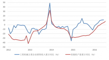 工程機械主要企業(yè)銷售收入及挖掘機產(chǎn)量累計同比