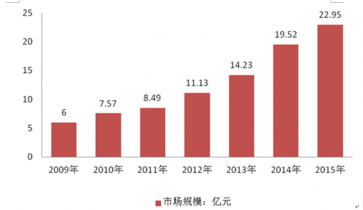 2015年我國自動售貨機行業銷售規模約12.82萬臺,行業市場規模約22.95億元,同比2014年的19.52億元增長了17.57%,近幾年我國自動售貨機行業市場規模情況如下圖所示: