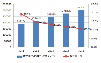 2011-2015年我國(guó)社會(huì)消費(fèi)品零售總額