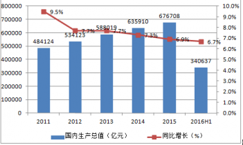 2011-2016H1中國(guó)國(guó)內(nèi)生產(chǎn)總值及增長(zhǎng)速度
