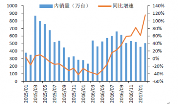 2017年2月空調(diào)產(chǎn)量1031.5萬臺(tái),同比增長66.2%;銷量1026.2萬臺(tái),同比增長71.6%,其中,內(nèi)銷量出現(xiàn)翻倍增長,2月空調(diào)內(nèi)銷量504.5萬臺(tái),同比增長115.6%,出口量521.7萬臺(tái),同比增長43.4%。