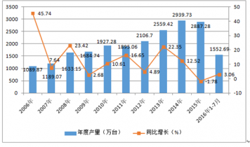 2006-2015年中國家用吸排油煙機(jī)產(chǎn)量及增長率統(tǒng)計表