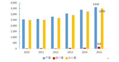 2010-2015年中國洗碗機(jī)產(chǎn)量及進(jìn)出口規(guī)模(單位:千套)