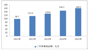2015年中國二手家電成交金額達到160.5億元,較2014年增長9.86%。