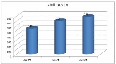 2015年我國(guó)洗衣液行業(yè)的產(chǎn)量達(dá)到804百萬(wàn)千克,同時(shí)洗衣液行業(yè)的銷量達(dá)到786百萬(wàn)千克。