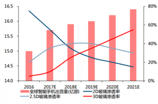2D-2.5D-3D蓋板玻璃逐步替代發(fā)展,3D玻璃有望成為智能手機(jī)主流配臵。蓋板玻璃一般位于觸控面板的頂部,主要起保護(hù)內(nèi)部元器件和提升產(chǎn)品美觀(guān)度的作用。目前智能產(chǎn)品使用的玻璃蓋板分為:2D玻璃、2.5D玻璃、還有3D玻璃。2D玻璃就是普通的純平面玻璃,沒(méi)有任何弧形設(shè)計(jì);2.5D玻璃則為中間是平面的,但邊緣是弧形設(shè)計(jì);而3D屏幕,無(wú)論是中間還是邊緣都采用弧形設(shè)計(jì)。隨著智能手機(jī)升級(jí)以及外觀(guān)新穎的要求,蓋板玻璃經(jīng)歷從2D-2.5D-3D的發(fā)展演變,以及搭載OLED智能手機(jī)滲透率逐漸提升,雙面3D玻璃有望成為智能手機(jī)的主流配臵。