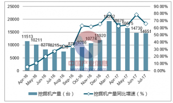 2017年1-7月中國(guó)挖掘機(jī)產(chǎn)量為117735臺(tái),同比增長(zhǎng)69.03%;2016年中國(guó)挖掘機(jī)產(chǎn)量為111395臺(tái),同比增長(zhǎng)19.36%。