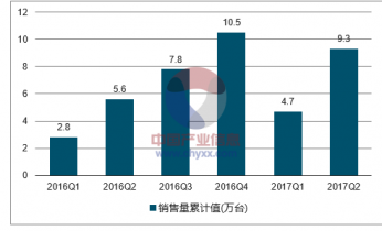 2017年1-6月中國(guó)挖掘機(jī)銷售量累計(jì)為9.3萬(wàn)臺(tái),同比增長(zhǎng)66.07%。2016年中國(guó)挖掘機(jī)銷售量累計(jì)為10.5萬(wàn)臺(tái)。