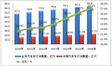 我國是全球最大的汽車車燈產(chǎn)銷市場,2016年全球汽車車燈產(chǎn)量為26.7億只,進(jìn)口量為0.66億只,出口量為4.64億只,表觀消費量為22.72億只。