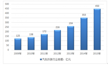 2009-2015年我國汽車改裝業(yè)規(guī)模走勢圖