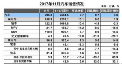 2017年11月,汽車生產(chǎn)308.03萬輛,環(huán)比增長18.69%,同比增長2.31%;銷售295.76萬輛,環(huán)比增長9.73%,同比增長0.65%。1-11月,汽車產(chǎn)銷2599.88萬輛和2584.49萬輛,同比增長3.88%和3.59%,增速比1-10月減緩0.39個百分點和0.54個百分點。
