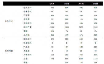 我們按照17-19年涂料總量增長7%/6%/5%,汽車漆、木器漆和工業(yè)漆等領(lǐng)域水性涂料滲透率每年提升5%進(jìn)行測算,未來三年水性涂料的增速為15%/13%/11%。水性涂料中主要還是以丙烯酸乳液為主,純聚氨酯乳液主要還是用于高端領(lǐng)域,因此我們預(yù)計(jì)丙烯酸在水性涂料領(lǐng)域的增速將于行業(yè)保持同步。