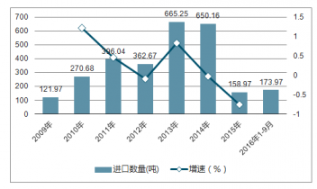 2009-2016年9月中國光瓷釉及類似制品(HS32073000)進口量及增速統(tǒng)計