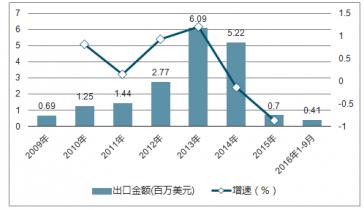 從出口額方面來看,數(shù)據(jù)顯示,2016年1-9月我國光瓷釉及類似制品出口金額為0.41百萬美元,與上年同期相比下降了24.07%。2015年我國光瓷釉及類似制品出口金額為0.70百萬美元,與上年同期相比下降了86.59%。