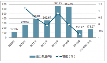 2009-2016年9月中國光瓷釉及類似制品(HS32073000)進口量及增速統(tǒng)計