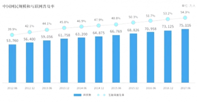 截至2017年6月,我國網民規模達到7.51億,半年共計新增網民1992萬人。互聯網普及率為54.3%,較2016年底提升1.1個百分點。