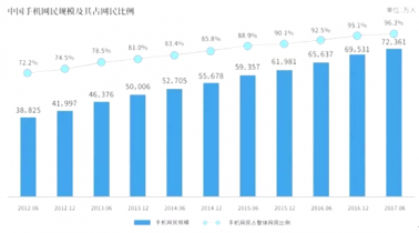 截至2017年6月,我國手機網民規模達7.24億,較2016年底增加2830萬人。網民使用手機上網的比例由2016年底的95.1%提升至96.3%。