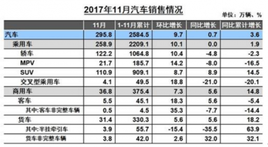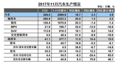 2017年11月,汽車生產(chǎn)308.03萬輛,環(huán)比增長18.69%,同比增長2.31%;銷售295.76萬輛,環(huán)比增長9.73%,同比增長0.65%。1-11月,汽車產(chǎn)銷2599.88萬輛和2584.49萬輛,同比增長3.88%和3.59%,增速比1-10月減緩0.39個百分點和0.54個百分點。