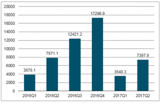 2016-2017年中國(guó)齒輪單月產(chǎn)量走勢(shì)圖