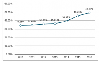 圖表:2011-2017年中國城鎮(zhèn)化率走勢(shì)圖
