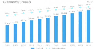 截至2017年6月,我國(guó)手機(jī)網(wǎng)民規(guī)模達(dá)7.24億,較2016年底增加2830萬(wàn)人。網(wǎng)民使用手機(jī)上網(wǎng)的比例由2016年底的95.1%提升至96.3%。