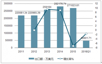2011-2016年中國胸罩及其他類似品出口額統(tǒng)計