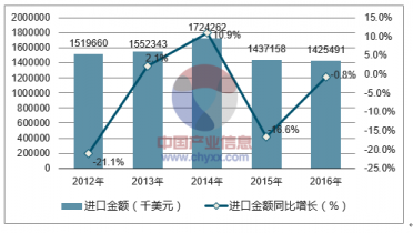 2012-2016年中國(guó)鋼鐵棒材進(jìn)口金額統(tǒng)計(jì)圖