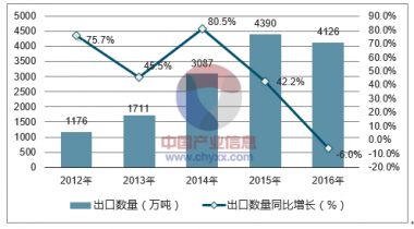 2012-2016年中國(guó)鋼鐵棒材出口數(shù)量統(tǒng)計(jì)圖