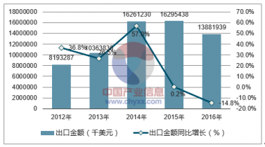 2012-2016年中國(guó)鋼鐵棒材出口金額統(tǒng)計(jì)圖