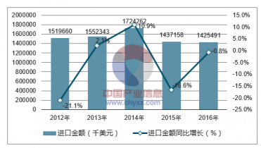 2012-2016年中國鋼鐵棒材進口金額統(tǒng)計圖