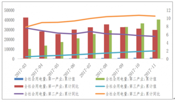 2017年1-11月,全國電力供需總體寬松,全社會用電量累計增速同比提高。全社會用電量累計57331億千瓦時,同比增長6.5%,增速比上年同期提高1.5個百分點。分產(chǎn)業(yè)看,1-11月份,第.一產(chǎn)業(yè)用電量1074億千瓦時,同比增長7.1%;第二產(chǎn)業(yè)用電量40185億千瓦時,同比增長5.5%;第三產(chǎn)業(yè)用電量8054億千瓦時,同比增長10.5%;城鄉(xiāng)居民生活用電量8018億千瓦時,同比增長7.7%。