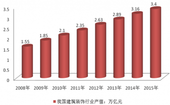 我國(guó)裝飾裝修行業(yè)保持穩(wěn)定增長(zhǎng)態(tài)勢(shì),2008年我國(guó)裝飾裝修行業(yè)總產(chǎn)值為1.55萬(wàn)億元,2015年我國(guó)建筑裝飾行業(yè)總產(chǎn)值達(dá)到3.4萬(wàn)億元。