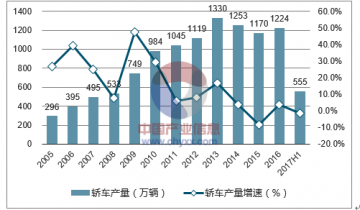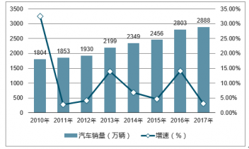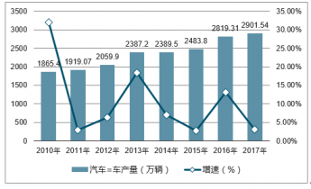 2017年中國汽車產(chǎn)量為2901.54萬輛,同比增長3.19%;2017年中國汽車銷量2887.89萬輛,同比增長3.04%。2017年中國汽車產(chǎn)銷量同比增長超3%,增速比上年同期回落11.27個百分點和10.61個百分點。
