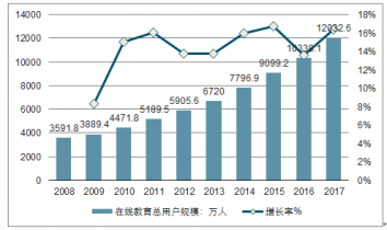 2008- 2017年在線教育用戶規(guī)模及預(yù)測(單位:萬人,%)