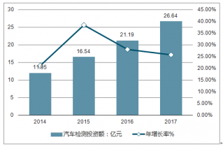 截止2017年底我國汽車檢測行業(yè)投資額累計達到26.64億元,較2016年(21.19)增長25.72%。