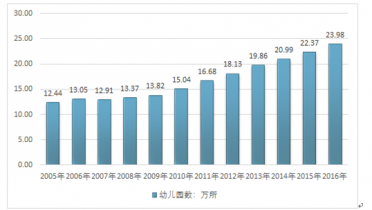 2016年底全國(guó)共有幼兒園23.98萬(wàn)所,比上年增加1.61萬(wàn)所,入園兒童1922.09萬(wàn)人,比上年減少86.76萬(wàn)人。在園兒童(包括附設(shè)班)4413.86萬(wàn)人,比上年增加149.03萬(wàn)人。幼兒園園長(zhǎng)和教師共249.88萬(wàn)人,比上年增加19.56萬(wàn)人。學(xué)前教育毛入園率達(dá)到77.4%,比上年提高2.4個(gè)百分點(diǎn)。