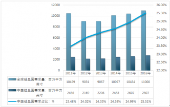 2011-2016年中國(guó)硅晶圓需求及占比全球比重