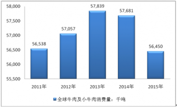 2011年全球牛肉及小牛肉消費量為5653.8萬噸,2014年增長至5768.1萬噸,2015年全球牛肉及小牛肉消費量為5645.0萬噸,同比下降2.1%。