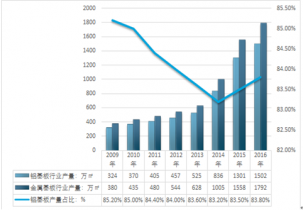 2009-2016年我國(guó)鋁基板行業(yè)產(chǎn)量及占比金屬基板產(chǎn)量比重 |