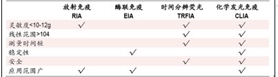 同位素放射免疫(RIA) | / | 試劑保存時(shí)間段、方式性物質(zhì)環(huán)境污染、手工操作 | 基本已被淘汰 |