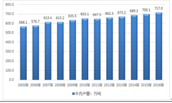 2005-2016年我國(guó)牛肉產(chǎn)量走勢(shì)圖 |