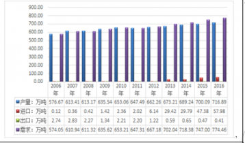 2006-2016年我國(guó)牛肉供需平衡統(tǒng)計(jì)圖 |