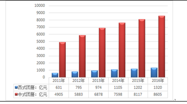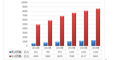 2016年我國團膳市場規(guī)模達到9925億元,從細分品類來看,受飲食習慣、烹飪方式、價位水平等諸多因素的影響,目前國內(nèi)以中式團膳為主,2016年年我國中式團膳消費市場規(guī)模為8605億元,占比為86.7%;西式團膳市場份額為1320億元,占比為13.3%。
