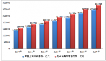 2016年全年,社會(huì)消費(fèi)品零售總額332316億元,比上年增長(zhǎng)10.4%。其中,限額以上單位消費(fèi)品零售額154286億元,增長(zhǎng)8.1%。2016年全年,餐飲收入35799億元,比上年增長(zhǎng)10.8%;商品零售296518億元,增長(zhǎng)10.4%。