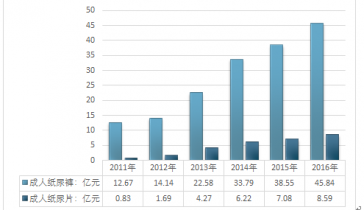 據(jù)統(tǒng)計(jì)2015年我國(guó)成人紙尿褲市場(chǎng)規(guī)模為38.55億元,2016年我國(guó)成人紙尿褲市場(chǎng)規(guī)模為45.84億元。
