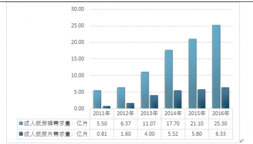 2011-2016年我國(guó)成人紙尿褲消費(fèi)量走勢(shì)圖 |