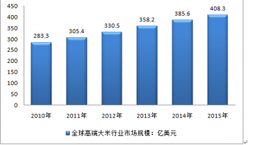 全球高端大米行業(yè)發(fā)展迅速,2010年全球高端大米行業(yè)市場規(guī)模為283.3億美元,2015年增長至408.3億美元。