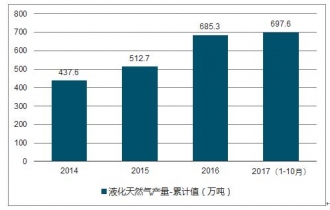 2019年1-10月中國液化天然氣產(chǎn)量為697.6萬噸,同比增長20.5%;2016年中國液化天然氣產(chǎn)量為695.3萬噸,同比增長29.9%。