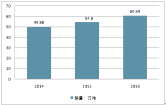 2014年我國香精香料行業(yè)產(chǎn)量為49.88萬噸,2015年達(dá)到54.80萬噸,同比上年增長9.8%。2016年全年的銷量為60.69萬噸,同比增長10.75%。